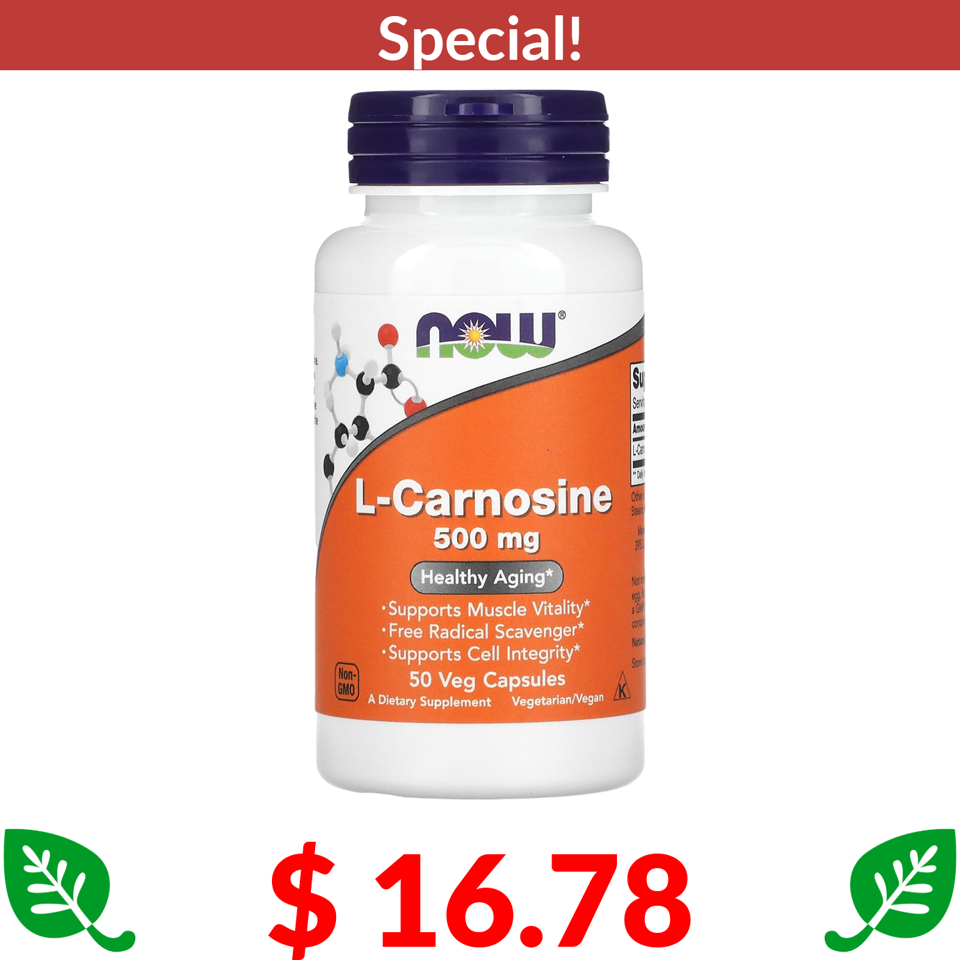 $ 16.78 NOW Foods, L-Carnosine, 500 mg, 50 Veg Capsules