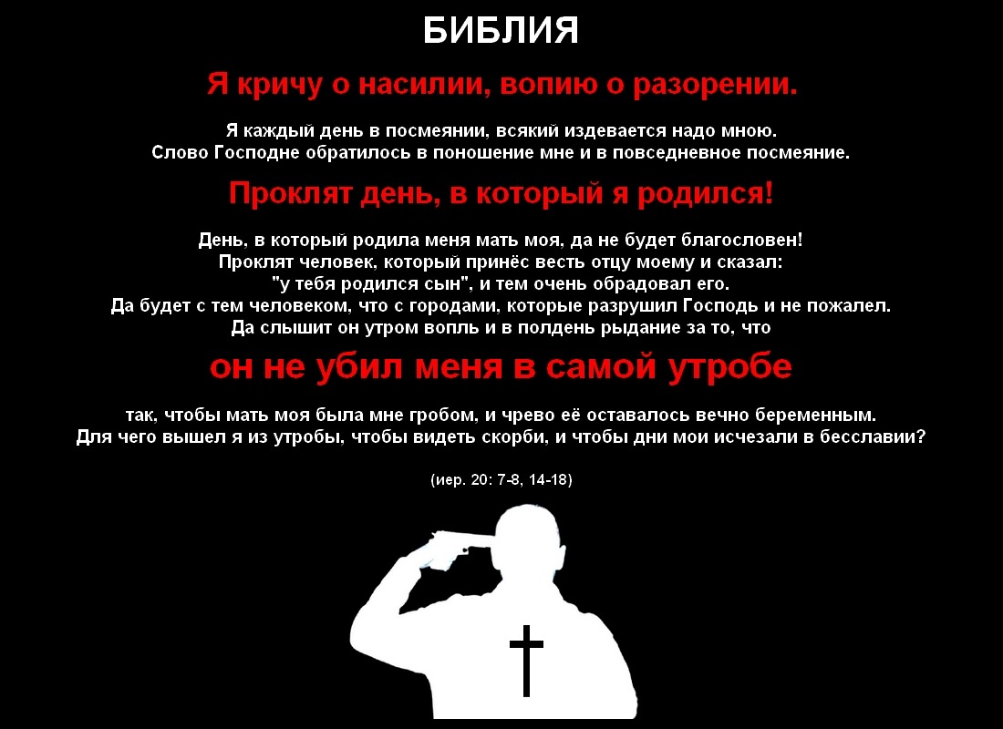 PavelВ двадцатой главе Иеремия сообщает, что из-за его антиобщественных проповедей, у него ожидаемо возникают проблемы. Например, один из священников даёт ему пиздюлей и сажает в колоду. (иер. 20: 1-2) На Иеремию накатывают приступы отчаяния и грусти, во время которых он проклинает день своего появления на свет, сожалеет, что не сдох при рождении. (иер. 20: 7-8, 14-18)