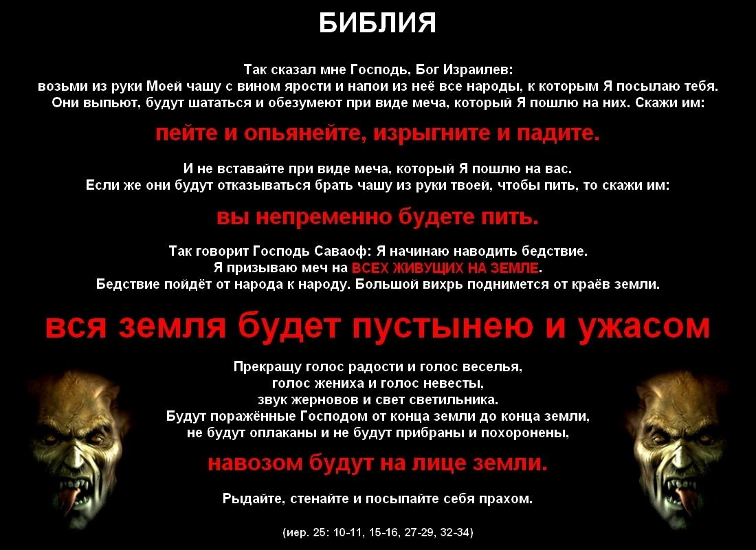 PavelВ двадцать пятой главе Иегова переключает своё внимание с иудеев уже на всех жителей земли и транслирует через Иеремию свою лютую ненависть к ним, обещая тотальное уничтожение людей. (иер. 25: 10-11, 15-16, 27-29, 32-34)