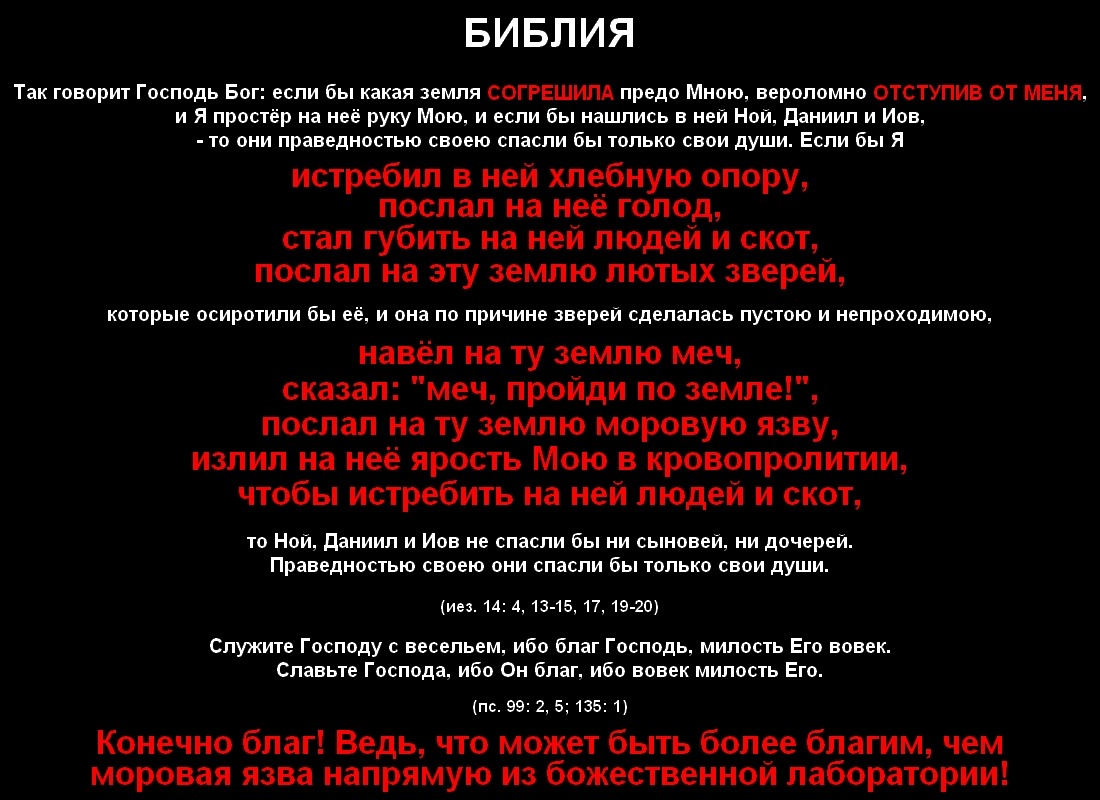 PavelВ четырнадцатой главе Иегова напоминает о том, что происходящие на Земле беды, - это последствия его маниакальной ярости. (иез. 14: 4, 13-15, 17, 19-20)
