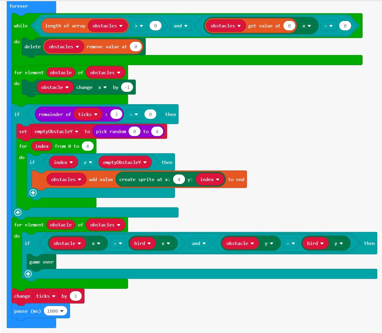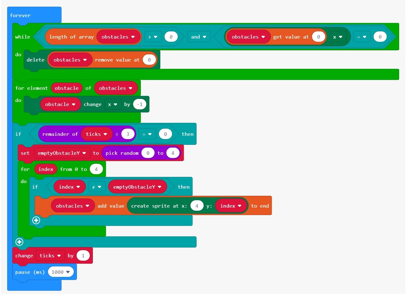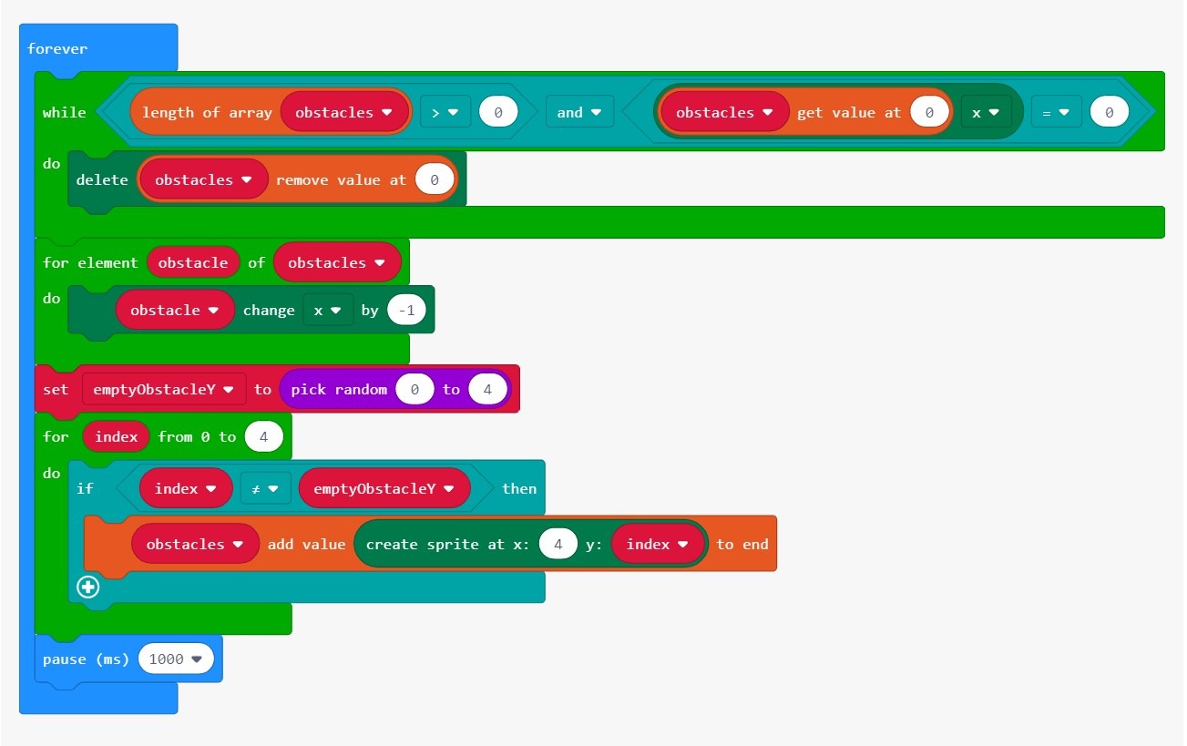 На данный момент наш код генерирует только одно вертикальное препятствие. Нам нужно поместить код генерации препятствий в цикл forever, чтобы он продолжал генерировать все больше и больше препятствий.