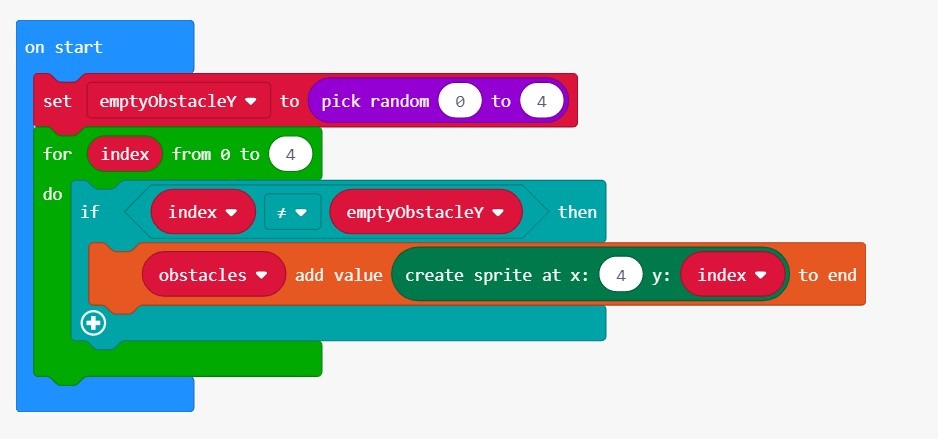 Используя для цикла, итерации от 0до 4. Для каждой координаты не равны emptyObstacleYсоздание и добавление спрайтов препятствий в конец obstaclesмассива.