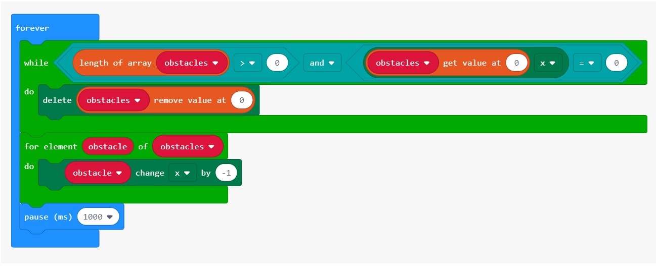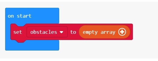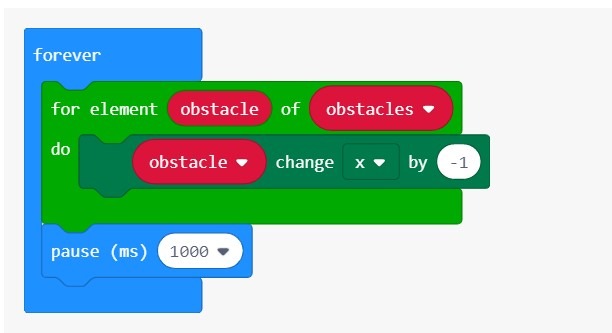 Получите доступ к каждому препятствию, используя цикл элемента for ( итерируйте по obstaclesмассиву) и уменьшите obstacle Xкоординату на 1. Щелкните правой кнопкой мыши на блоке значений и переименуйте его в препятствие ; затем перетащите этот блок препятствий поверх спрайта в блоке change x .