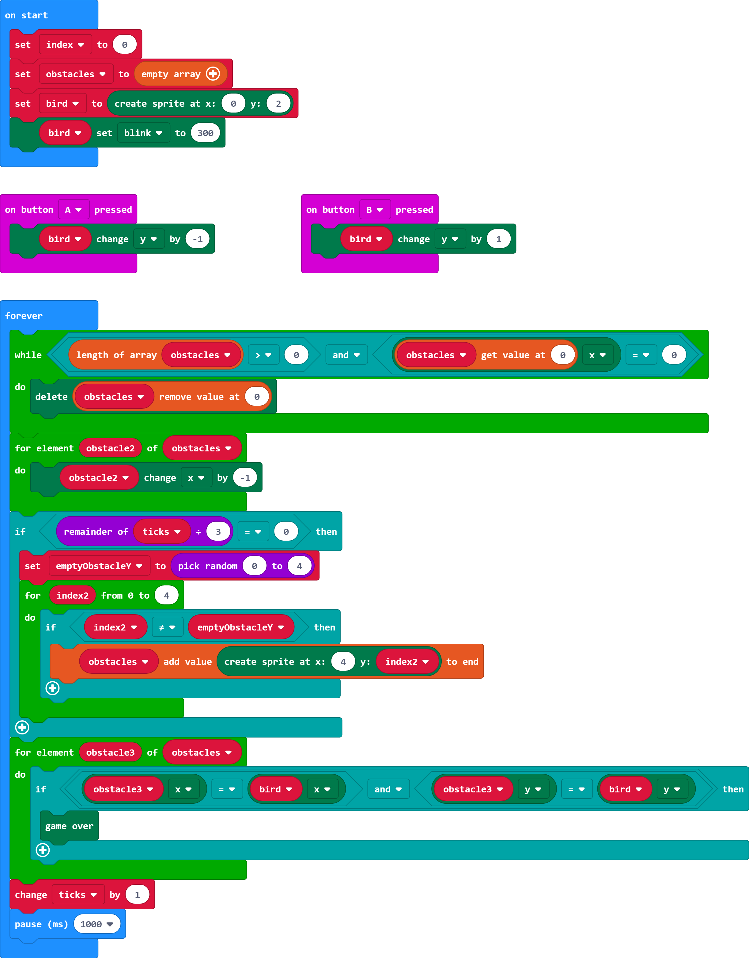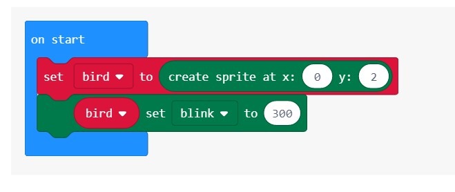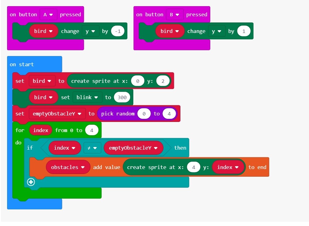 Прежде чем создавать код для игровых действий, давайте сначала добавим некоторые элементы управления, чтобы мы могли передвигать спрайт птицы. Мы будем управлять птицей, нажимая кнопку A , чтобы подняться, или кнопку B , чтобы опуститься.