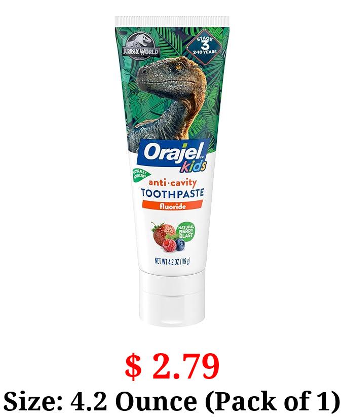 $ 2.79 Size: 4.2 Ounce (Pack of 1) Orajel Kids Jurassic World Anti-Cavity Fluoride Toothpaste, Natural Berry Blast Flavor, 4.2oz Tube
