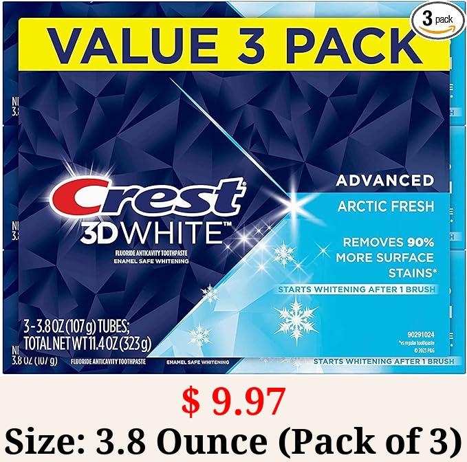 $ 9.97 Size: 3.8 Ounce (Pack of 3) Crest 3D White Arctic Fresh Teeth Whitening Toothpaste, 3.8 oz, Pack of 3
