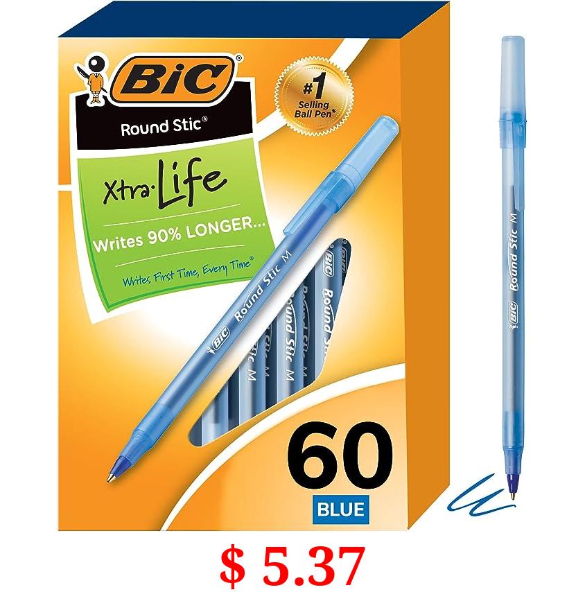 $ 5.37 BIC Round Stic Xtra Life Blue Ballpoint Pens, Medium Point (1.0mm), 60-Count Pack of Bulk Pens, Flexible Round Barrel for Writing Comfort, No. 1 Selling Ballpoint Pens