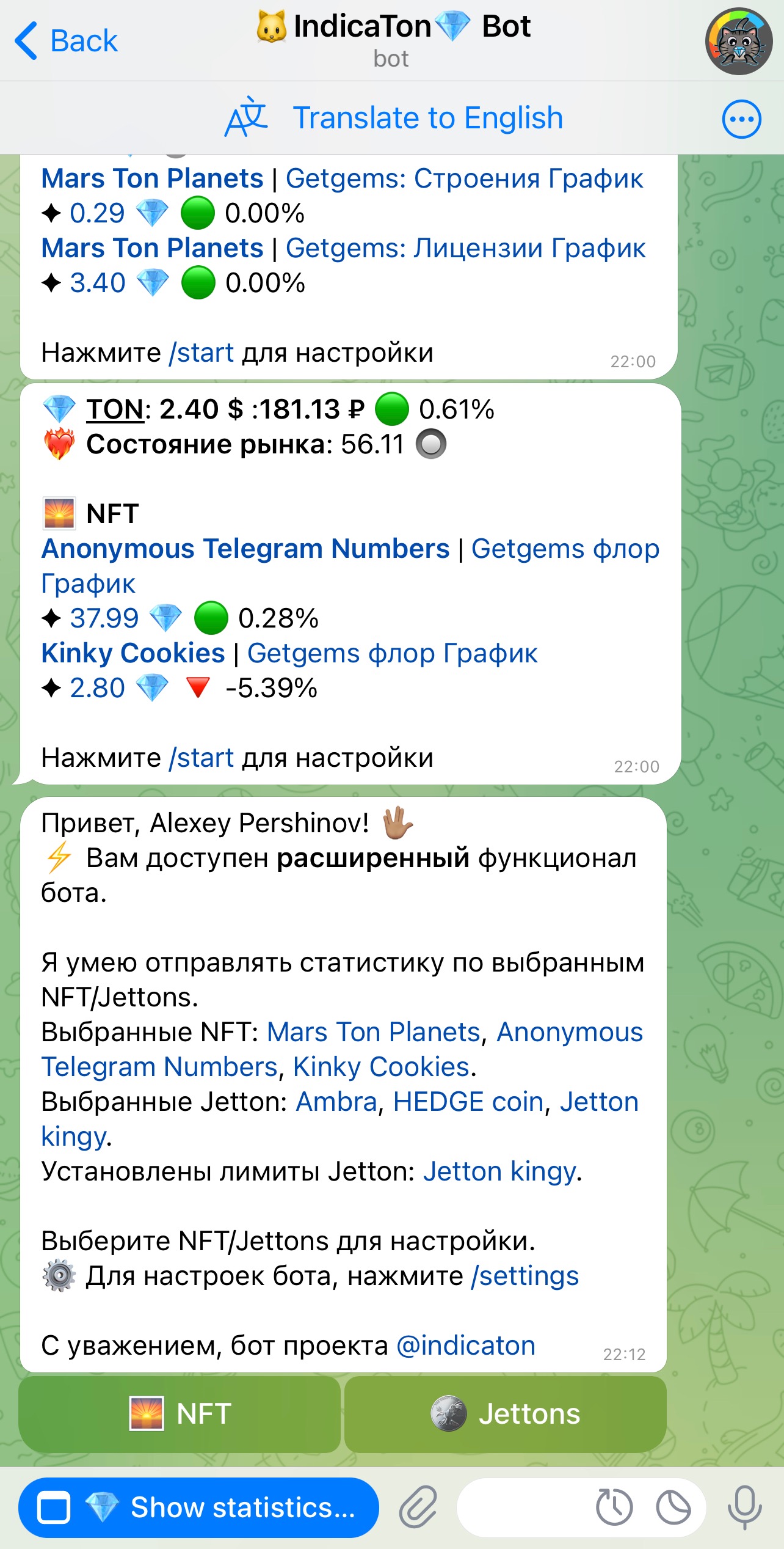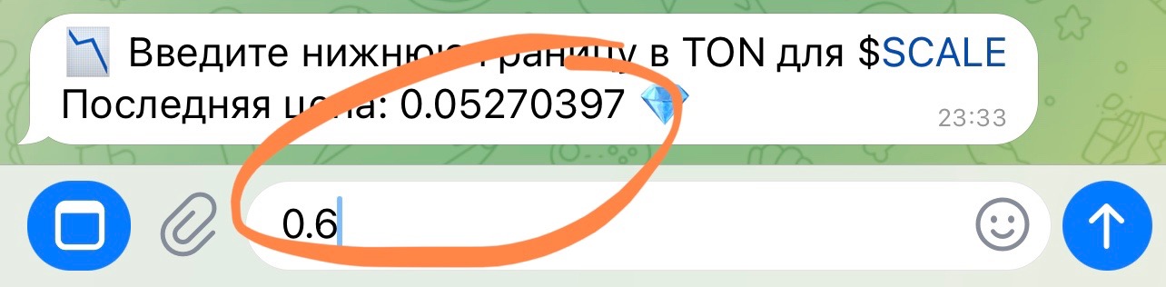 Вы можете указать нижнюю и верхнюю границы для стоимости жетона в TON. Бот сообщит вам, когда эти границы будут достигнуты.