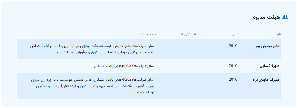- شرکت داده پردازان دوران در سال ۱۳۷۸ با شماره ۱۷۲۱۹۶ در اداره ثبت شرکتهای تهران با هدف فعالیت تولیدی / بازرگانی در حوزه تولید نرم افزار تاسیس شده است.