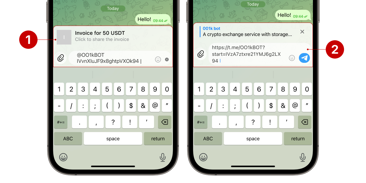 The easiest and most convenient way to create an invoice is through inline mode. To do this, enter the command in the message field in any chat, group, or channel: