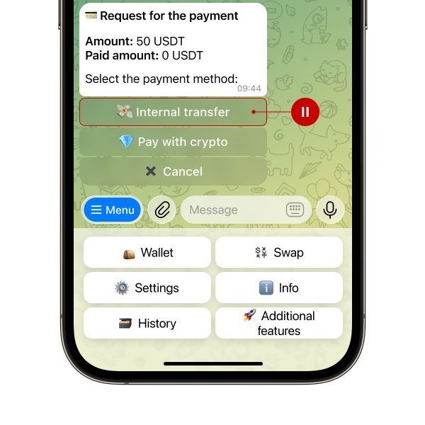 Available options: internal transfer via bot or payment in cryptocurrency (possible both via bot and via external services (at the address).