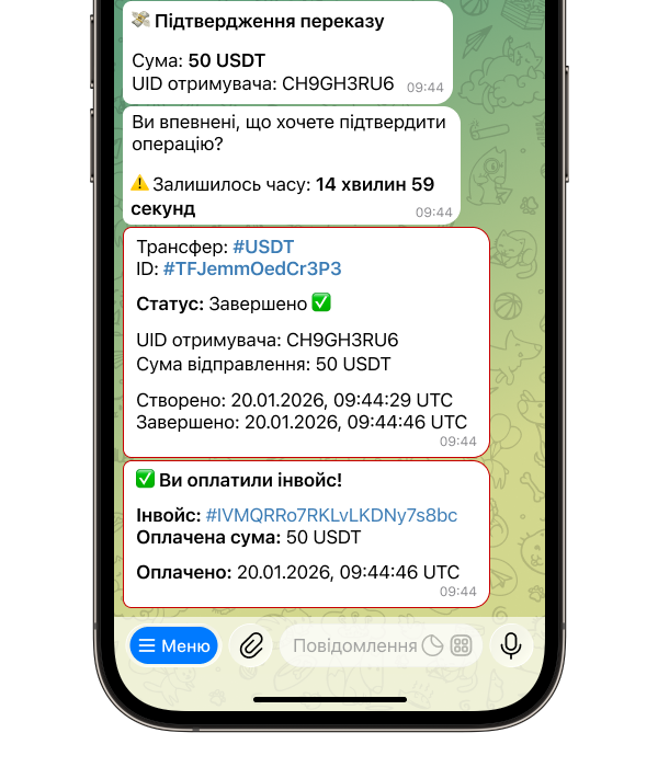 ⏳ Термін дії: інвойс з фіксованою сумою активний до повної оплати або доки ви не закриєте його вручну. Інвойс без суми — необмежений у часі чи сумі (ідеально для умовних донатів або постійних посилань на оплату).