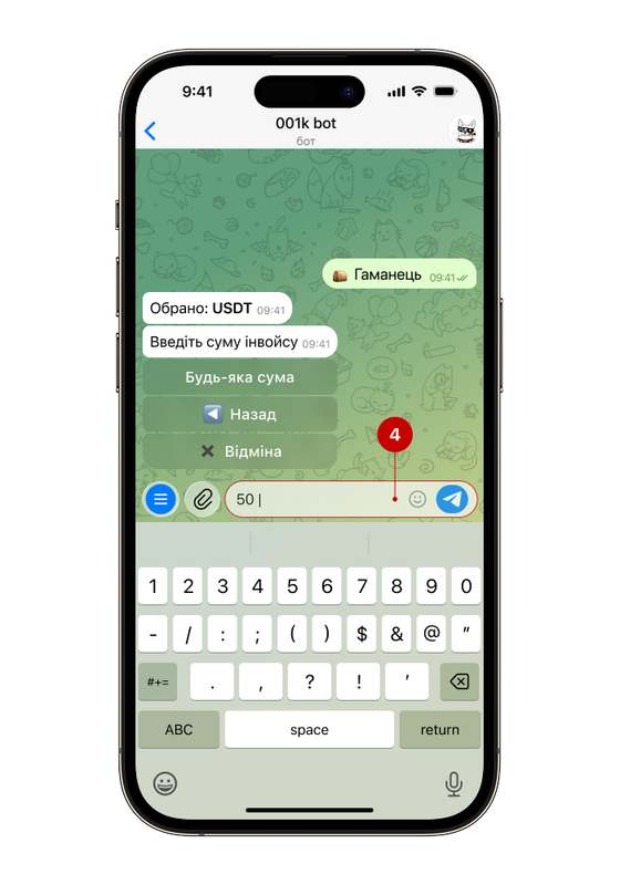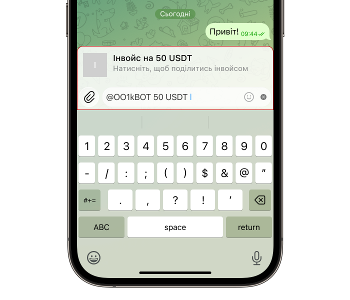 Найпростіший та найзручніший спосіб створити інвойс — без переходу в меню бота. Для цього у будь-якому чаті, групі або каналі введіть команду в полі для повідомлення: