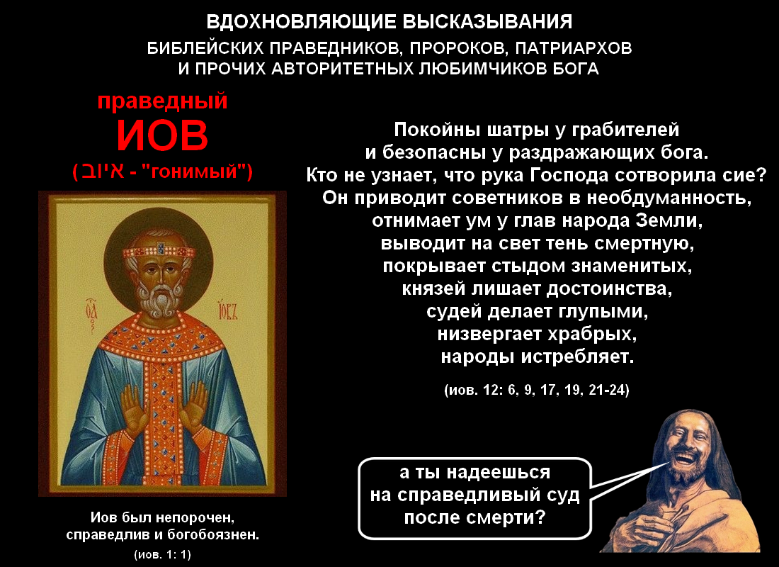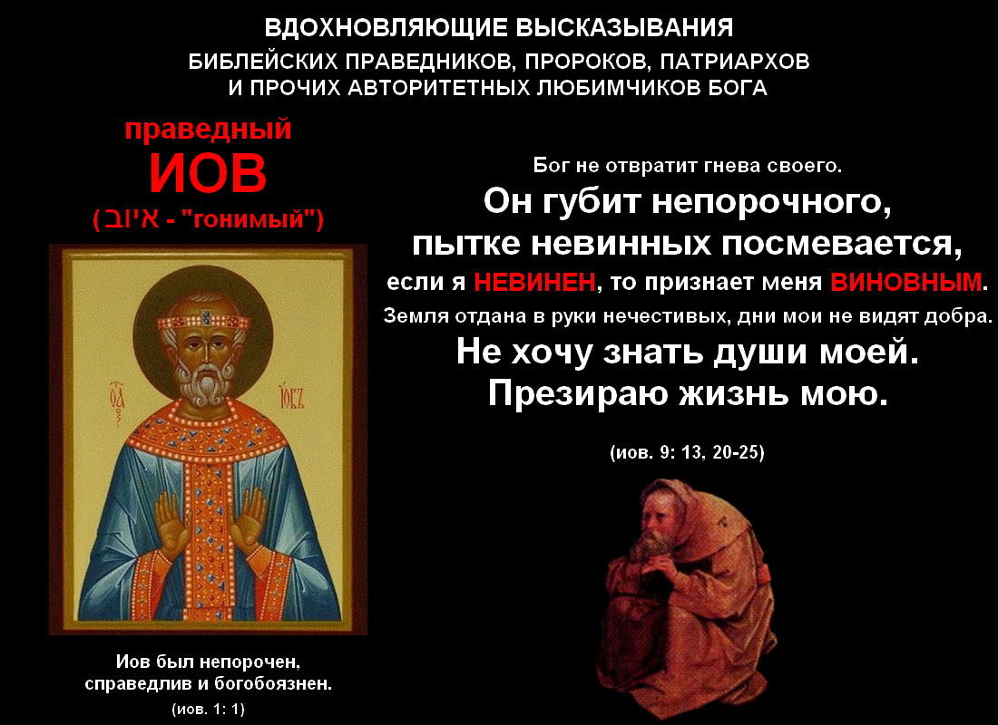 Ну а наиболее серьёзные обвинения бога в несправедливости, предъявляемые ему праведным Иовом, находятся соответственно в девятой, двенадцатой и шестнадцатой главах: