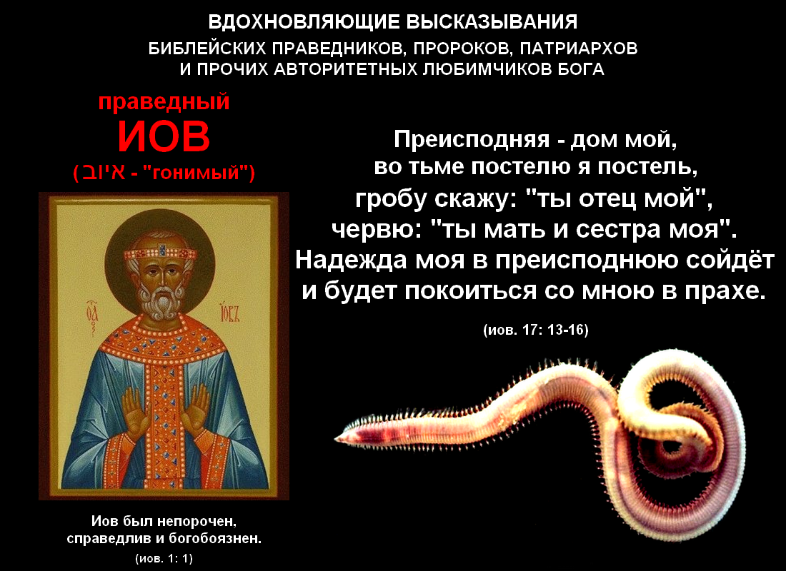 "преисподняя - дом мой, во тьме постелю я постель, гробу скажу: "ты отец", червю: "ты мать и сестра", надежда моя будет покоиться со мною в прахе".