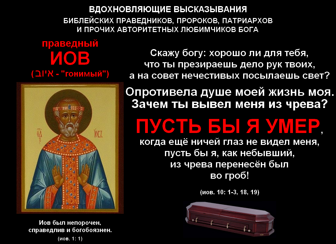 "Земля отдана в руки нечестивых, дни мои не видят добра, не хочу знать души моей, презираю жизнь мою";