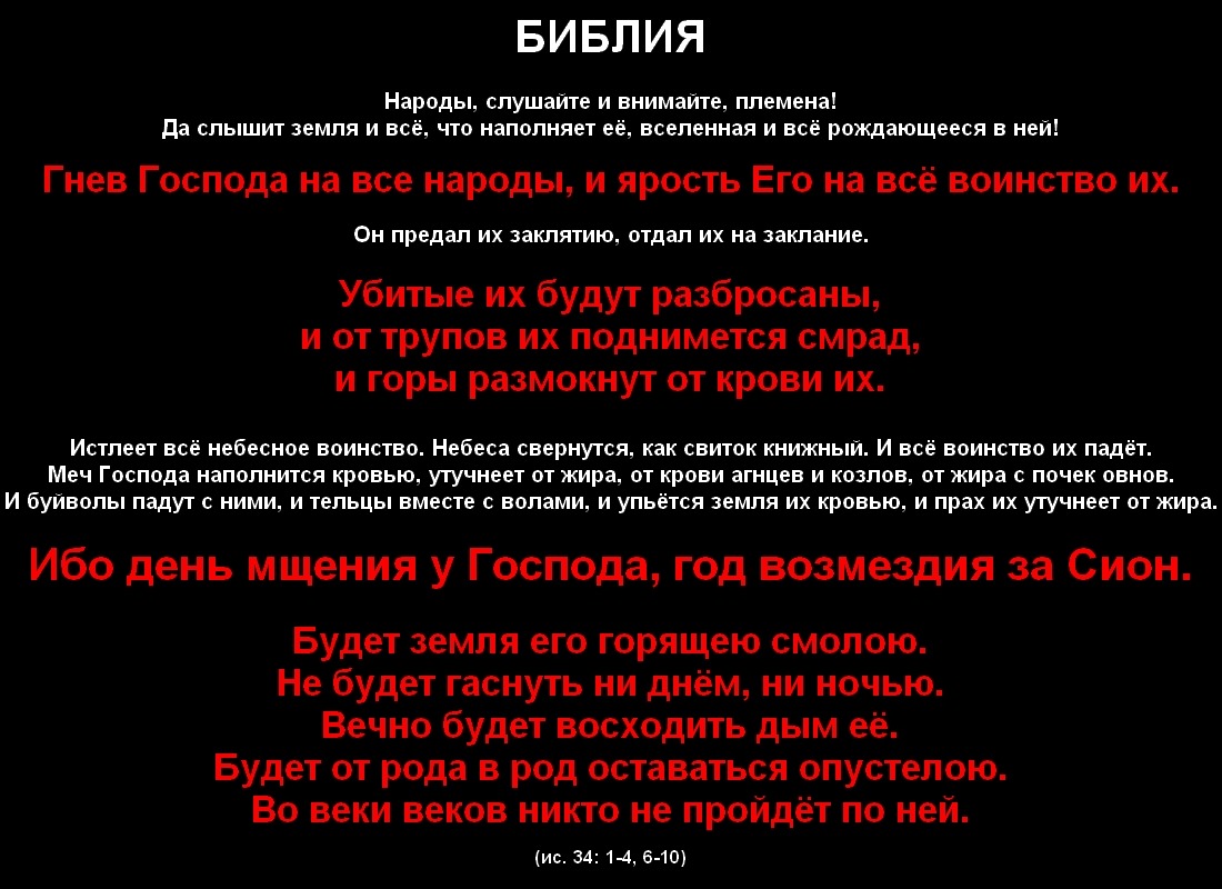 PavelВ тридцать четвёртой главе Исайю прорывает поток ненависти ко всем людям. Он обещает, массовую гибель, которую устроит Иегова. При чём не только людям, но и животным. (ис. 34: 1-4, 6-10)