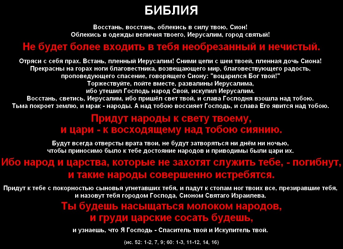 PavelВ шестидесятой главе Исайя предрекает торжество Сиона над всей землёй. (ис. 60: 1-3, 11-12, 14, 16)