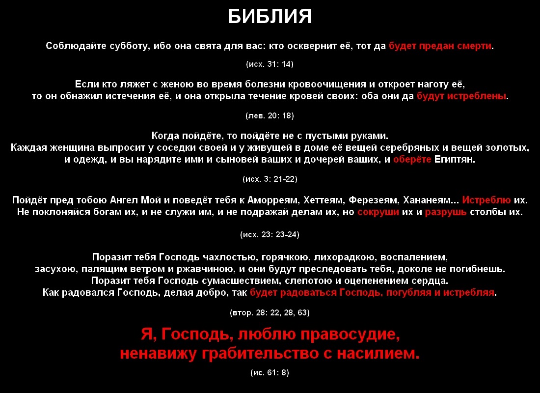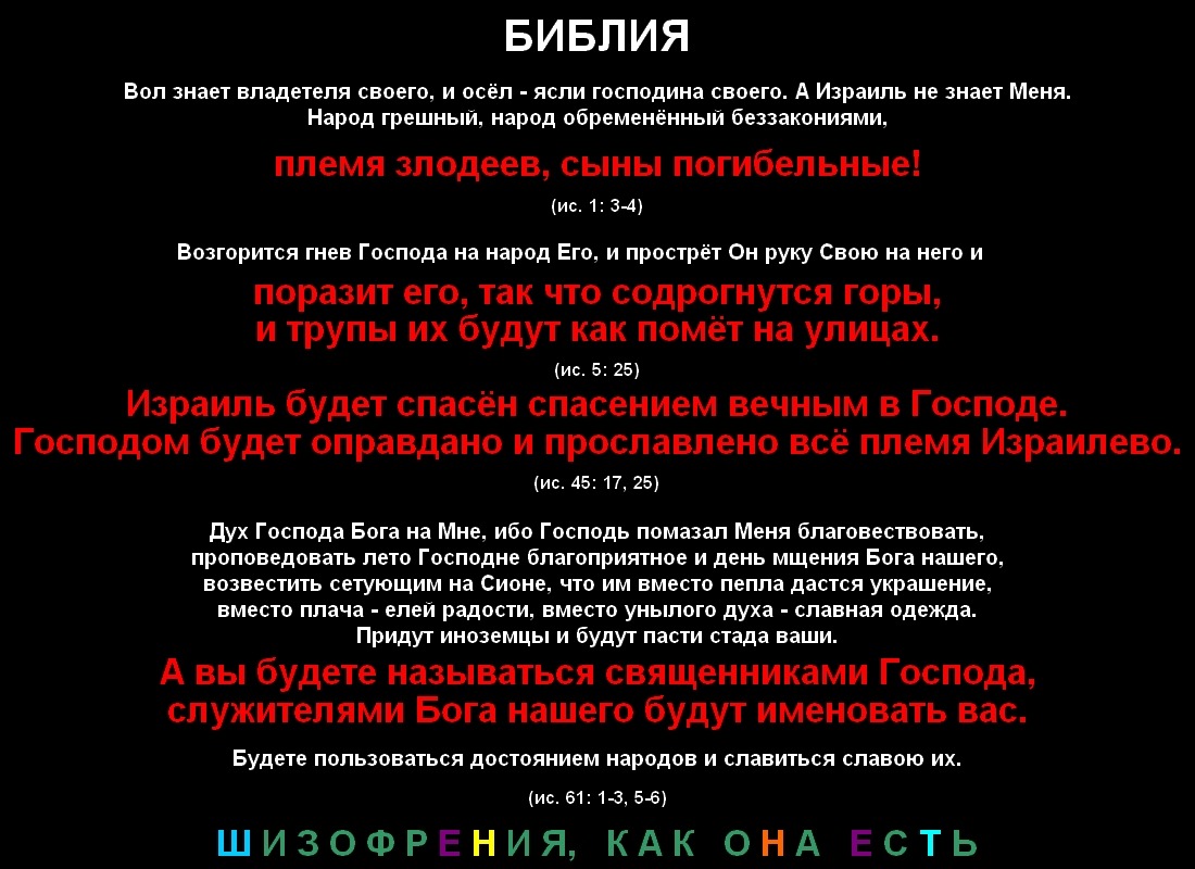 PavelВ шестьдесят первой главе Исайя продолжает убеждать в том, что грядёт торжество Сиона. (ис. 61: 1-3, 5-6) Также он сообщает, что Иегова ненавидит насилие. (ис. 61: 8) Это противоречит огромному массиву информации, согласно которой Иегова обожает насилие. Таким образом, Иегова, говорящий через Исайю, - не только злое и глупое существо, но ещё и лживое.