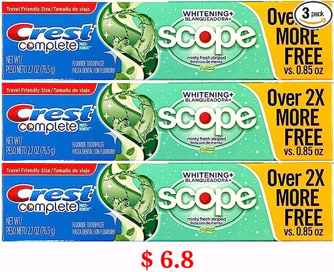 $ 6.8 Crest Complete Multi-Benefit Whitening + Scope Minty Fresh Flavor Toothpaste 2.7 Oz, Pack of 3
