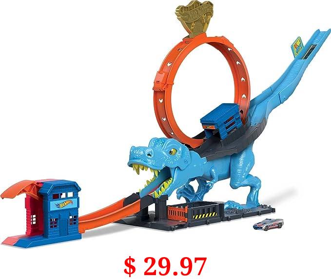 $ 29.97 Hot Wheels Toy Car Track Set City T-Rex Chomp Down with 1:64 Scale Car, Knock Out the Giant Dinosaur with Stunts Small