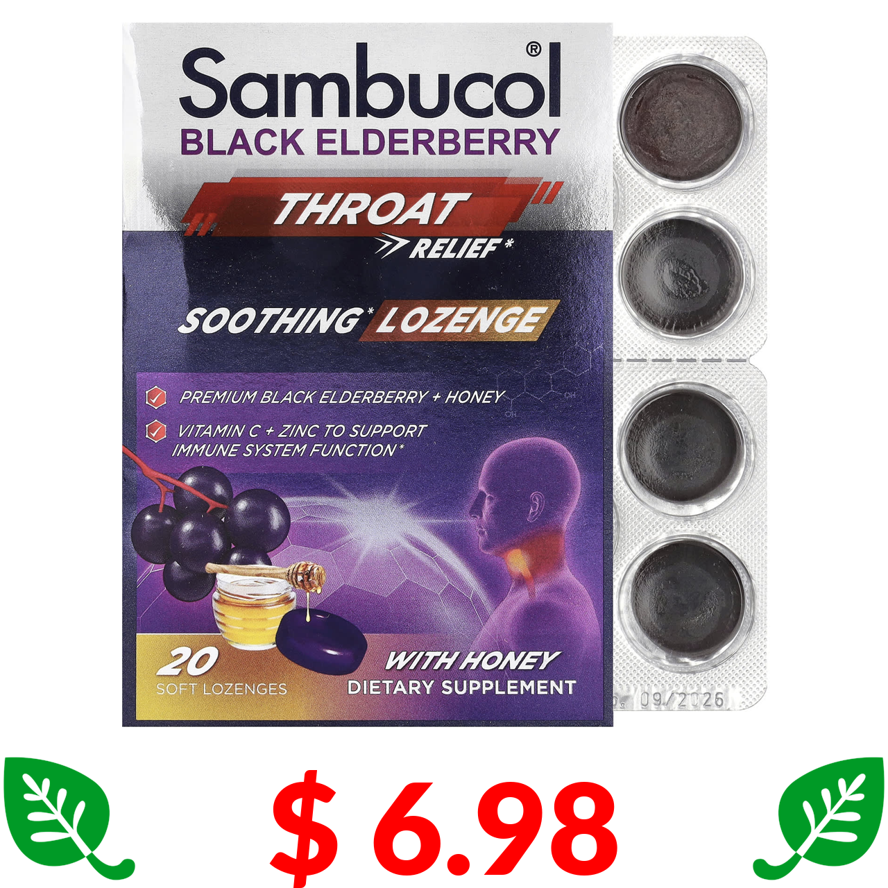 $ 6.98 Sambucol, чорна бузина, заспокійливі пастилки для горла з медом, 20 м’яких пастилок