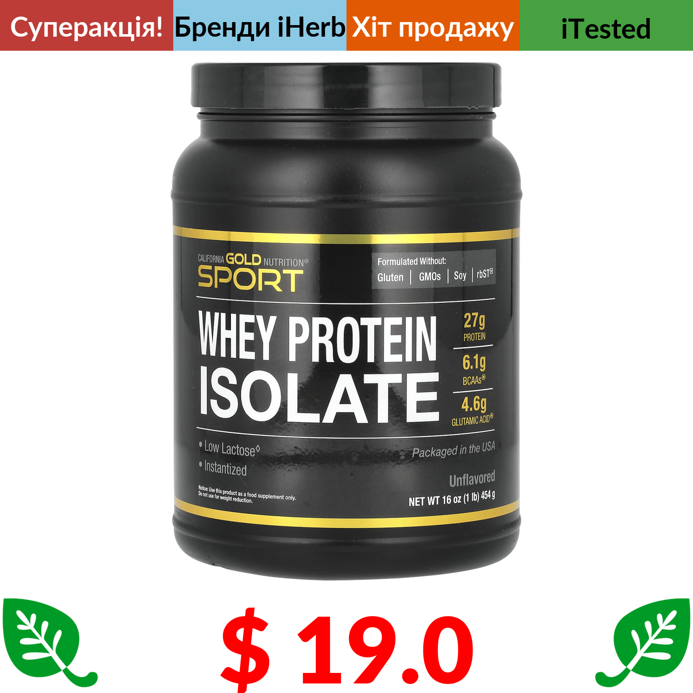 $ 19.0 California Gold Nutrition, Sport, ізолят сироваткового протеїну, без ароматизаторів, 454 г (1 фунт)