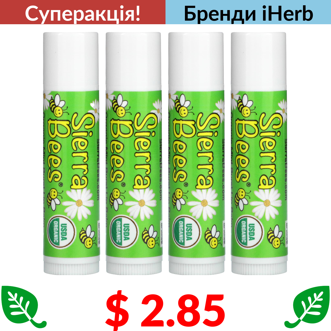 $ 2.85 Sierra Bees, органічні бальзами для губ, зі смаком м’яти, 4 шт. в упаковці по 4,25 г (0,15 унції)
