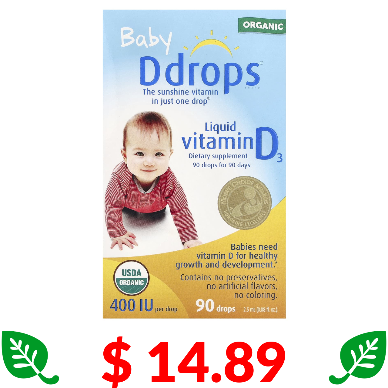 $ 14.89 Ddrops, Baby, рідкий вітамін D3, для дітей, 400 МО, 90 крапель, 2,5 мл (0,08 рідк. унції)