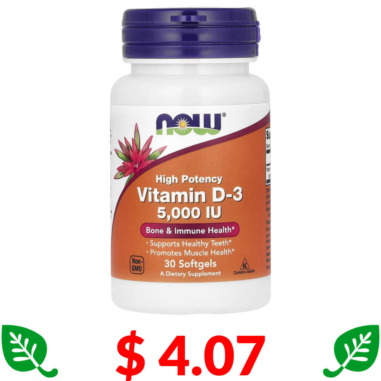 $ 4.07 Now Foods, вітамін D3, висока ефективність, 5000 МО, 30 капсул