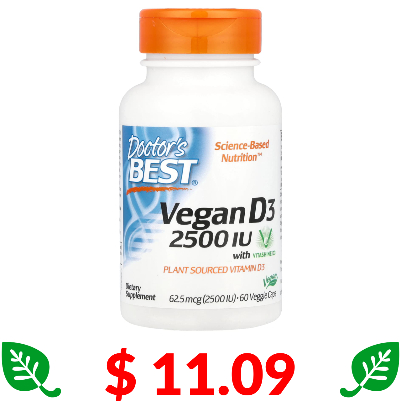 $ 11.09 Doctor's Best, веганський вітамін D3 з Vitashine D3, 2500 МО, 60 веганських капсул