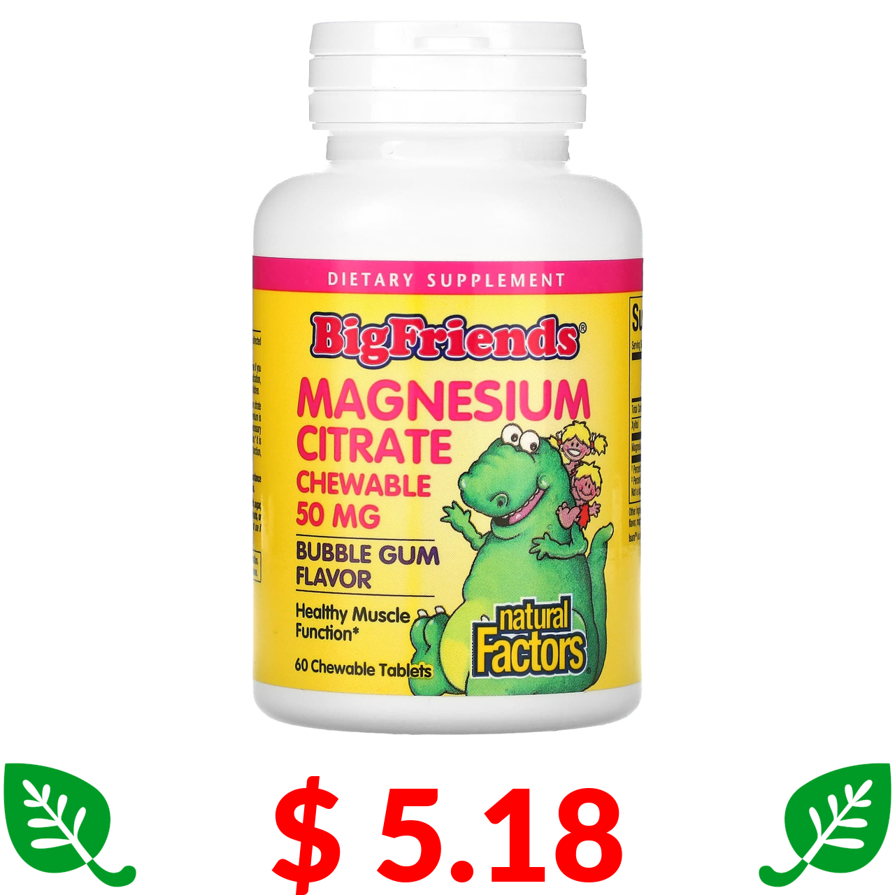 $ 5.18 Natural Factors, Big Friends, цитрат магнію, зі смаком жувальної гумки, 50 мг, 60 жувальних таблеток