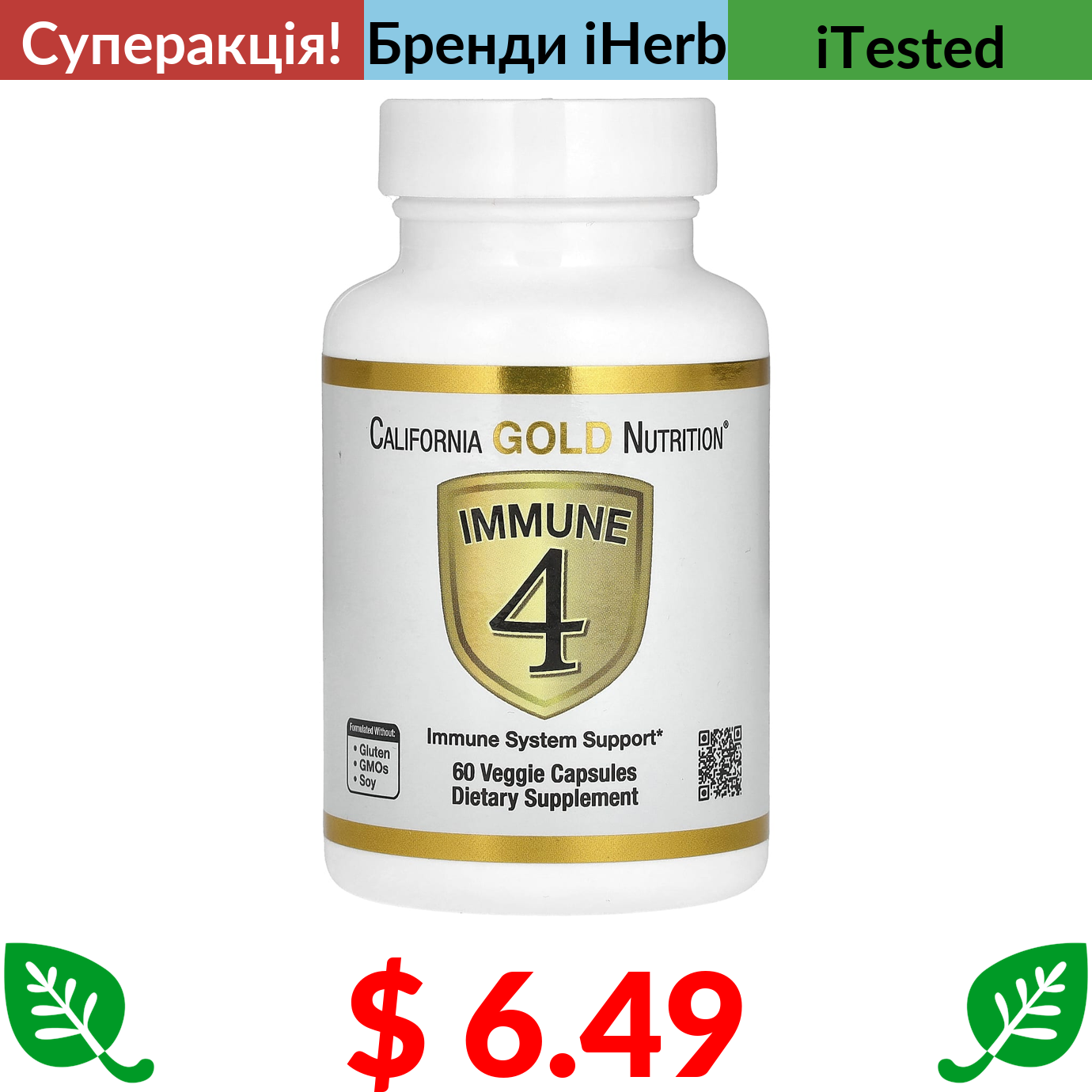 $ 6.49 California Gold Nutrition, Immune 4, засіб для зміцнення імунітету, 60 вегетаріанських капсул