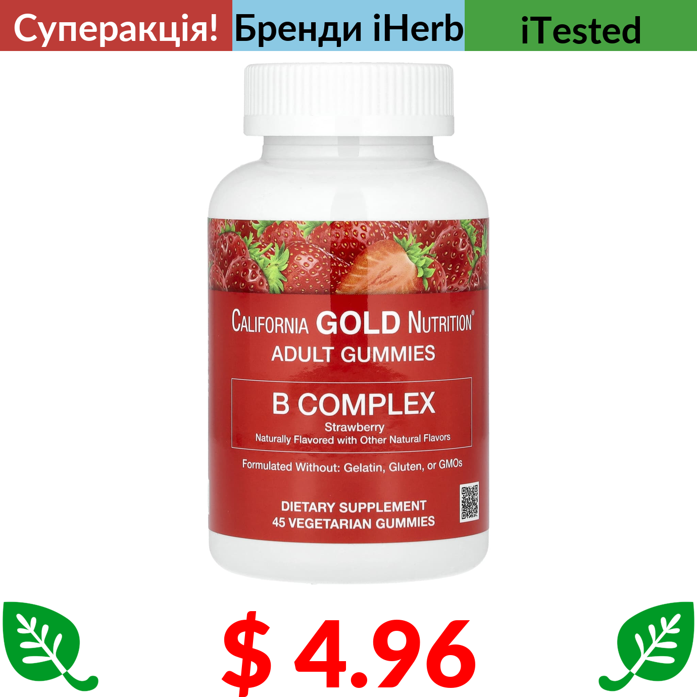 $ 4.96 California Gold Nutrition, комплекс вітамінів групи B, зі смаком полуниці, 45 вегетаріанських жувальних мармеладок