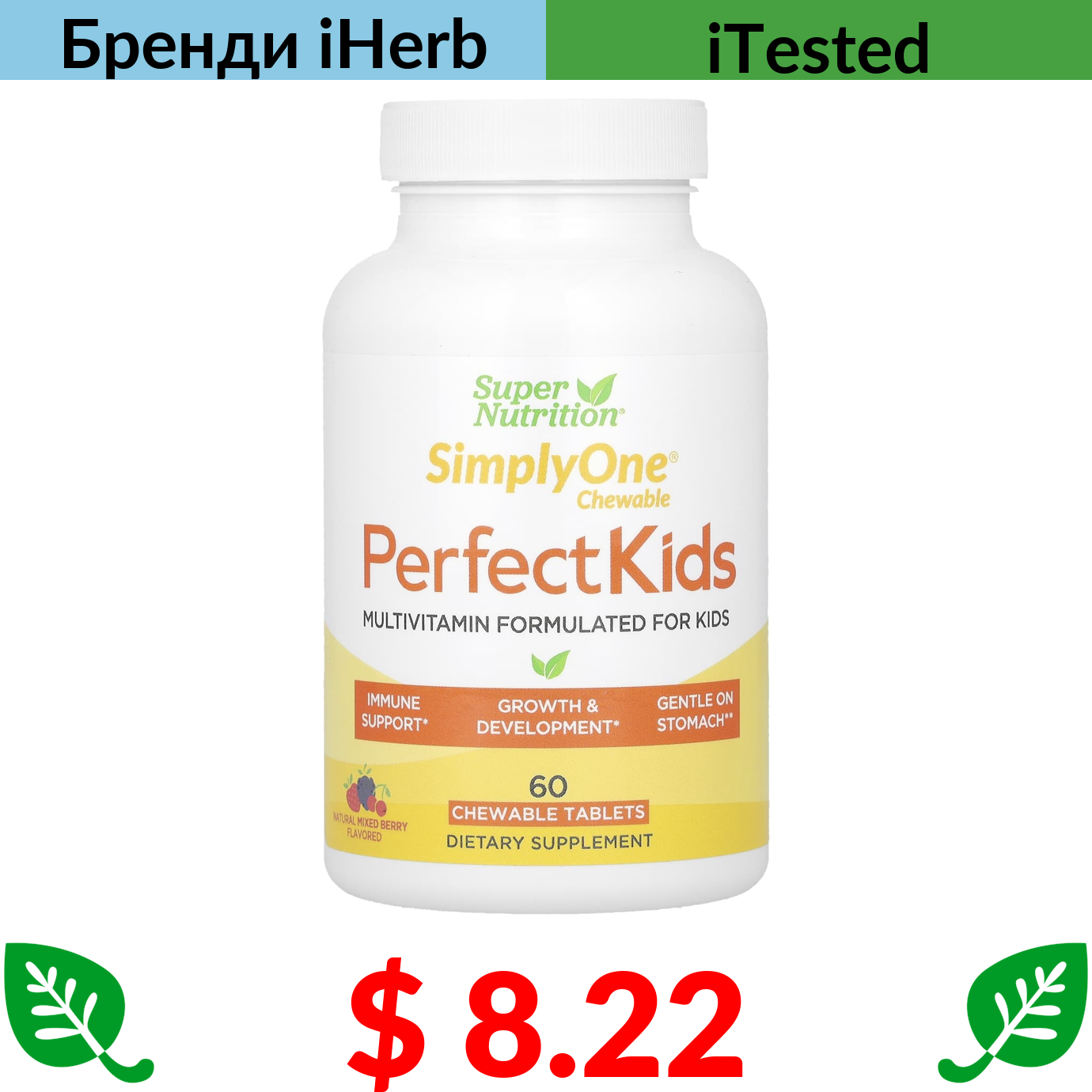 $ 8.22 Super Nutrition, Perfect Kids, комплекс мультивітамінів для дітей, зі смаком лісових ягід, 60 вегетаріанських жувальних таблеток