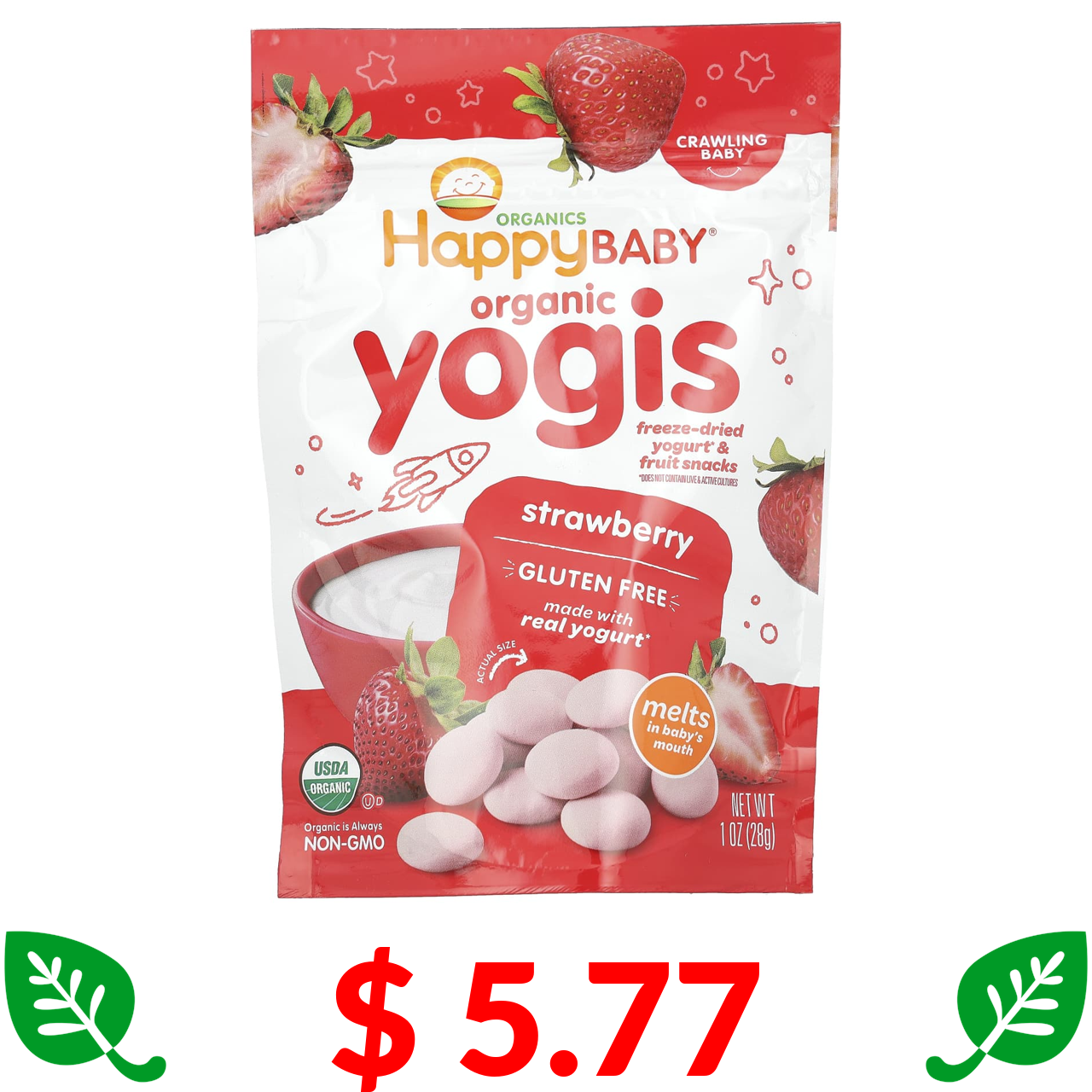 $ 5.77 Happy Family Organics, Yogis, органічні снеки з сублімованого йогурту та фруктів, полуниця, 28 г (1 унція)