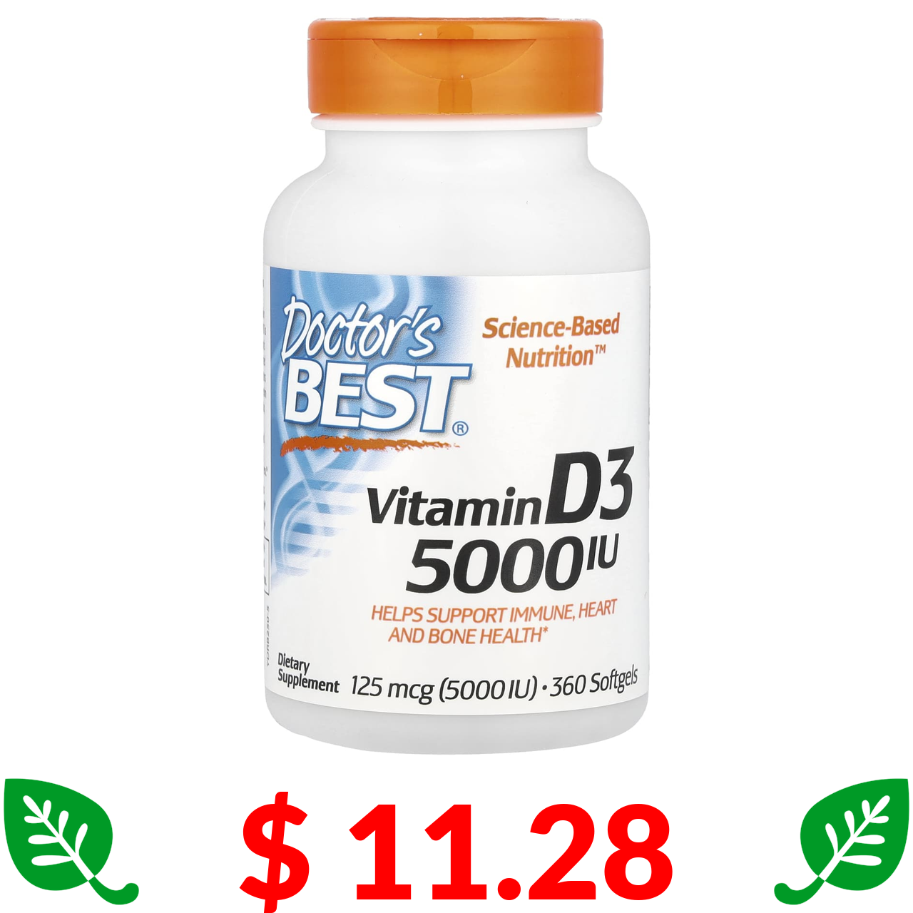 $ 11.28 Doctor's Best, вітамін D3, 125 мкг (5000 МО), 360 капсул