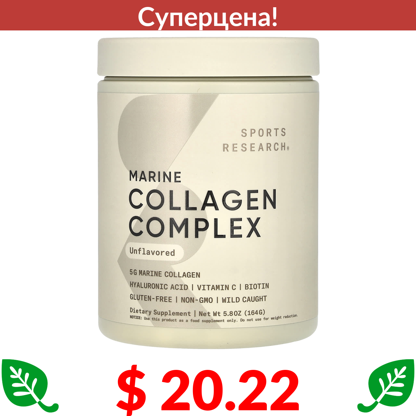 $ 20.22 Спортс Ресерч, комплекс с морским коллагеном, без добавок, 164 г (5,8 унции)