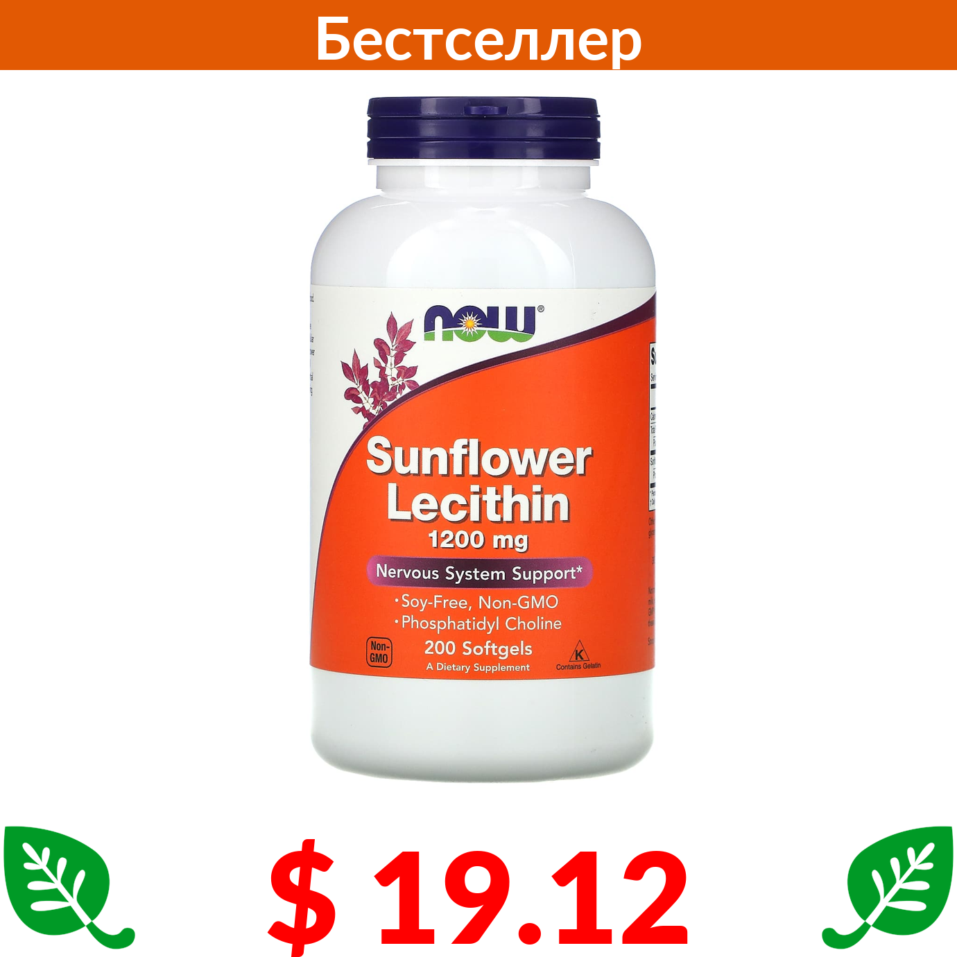 $ 19.12 Now Foods, подсолнечный лецитин, 1200 мг, 200 капсул