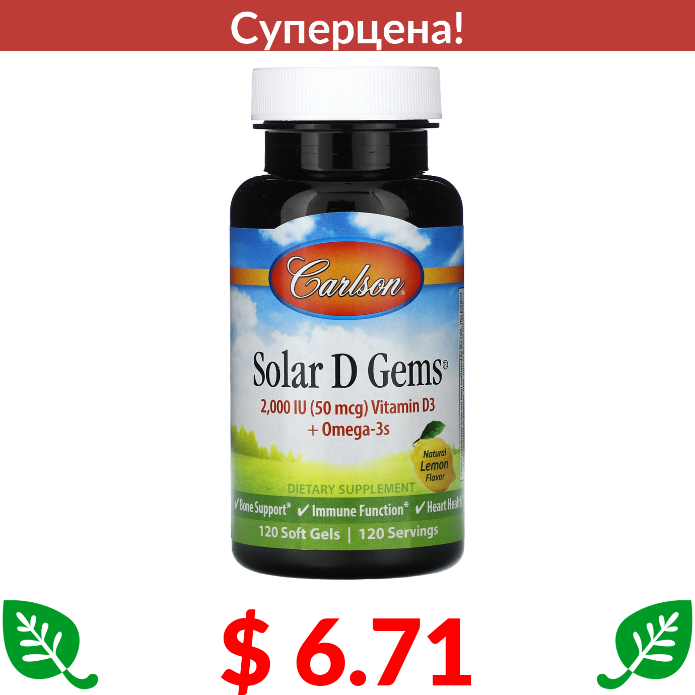 $ 6.71 Carlson, Solar D Gems, натуральный лимон, 50 мкг (2000 МЕ), 120 мягких таблеток