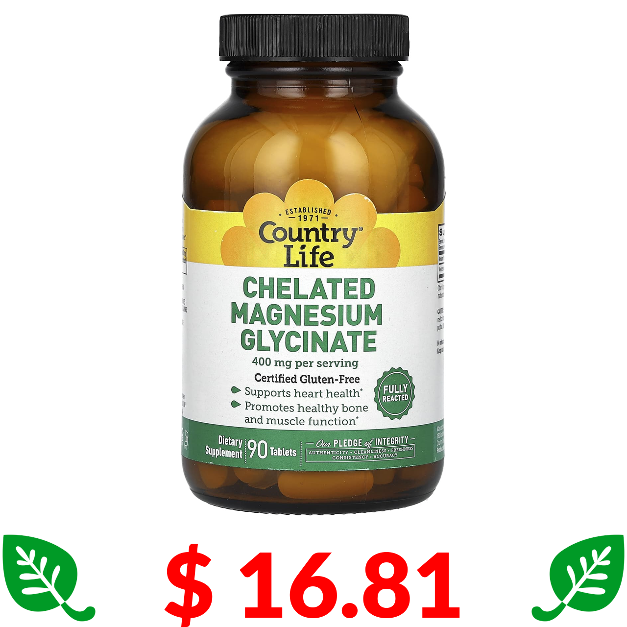 $ 16.81 Кантри Лайф, хелатный глицинат магния, 400 мг, 90 таблеток (133 мг в 1 таблетке)