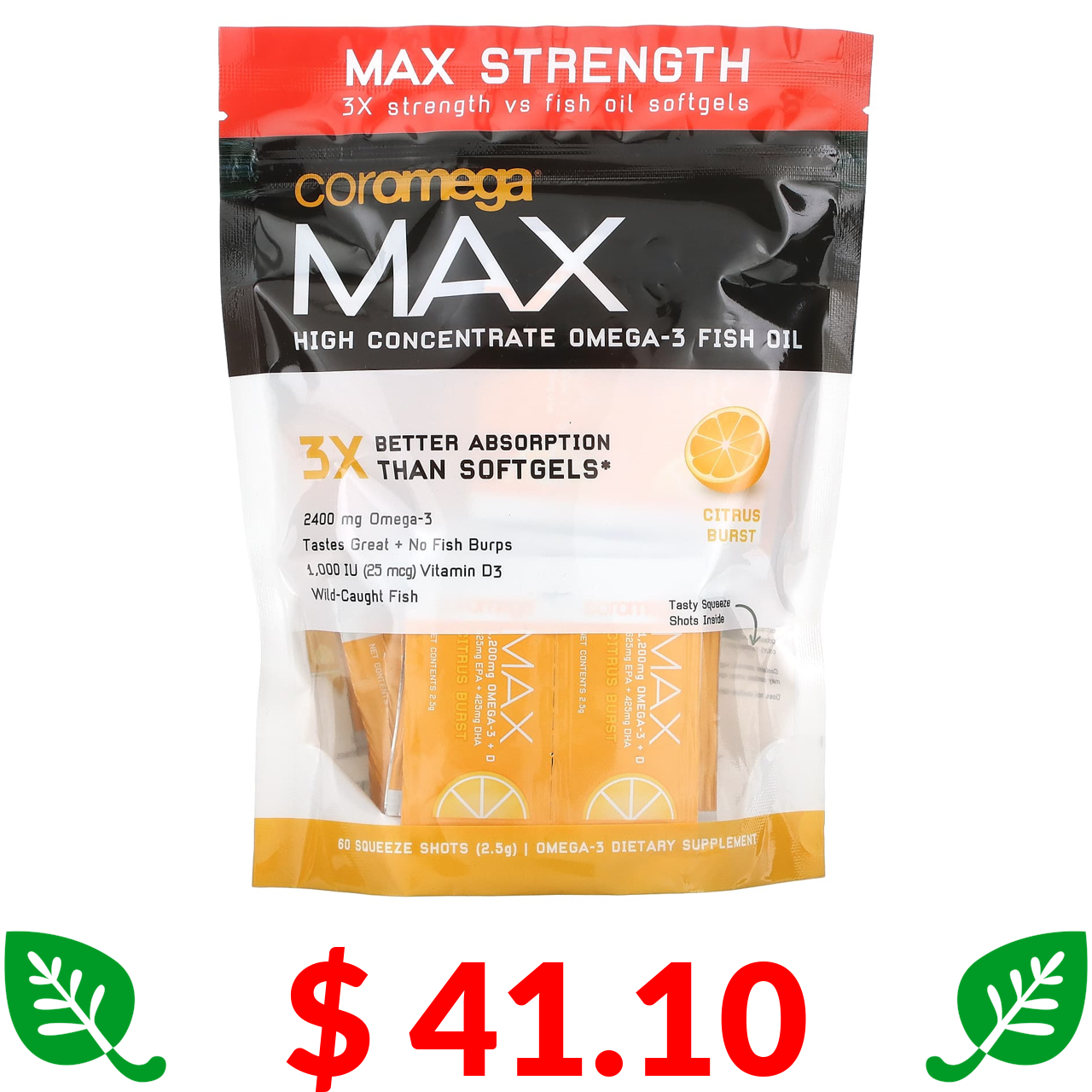 $ 41.10 Coromega, Max, High Concentrate Omega-3 Fish Oil, Citrus Burst, 60 Squeeze Shots, (2.5 g) Each