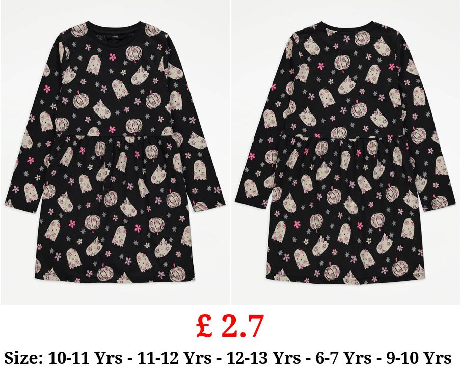£ 2.7 Halloween Black Floral Ghost Print Long Sleeve Dress