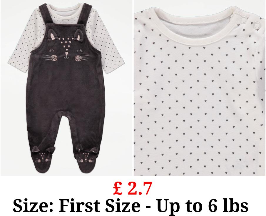 £ 2.7 Grey Velour Cat Dungarees and Heart Bodysuit Outfit