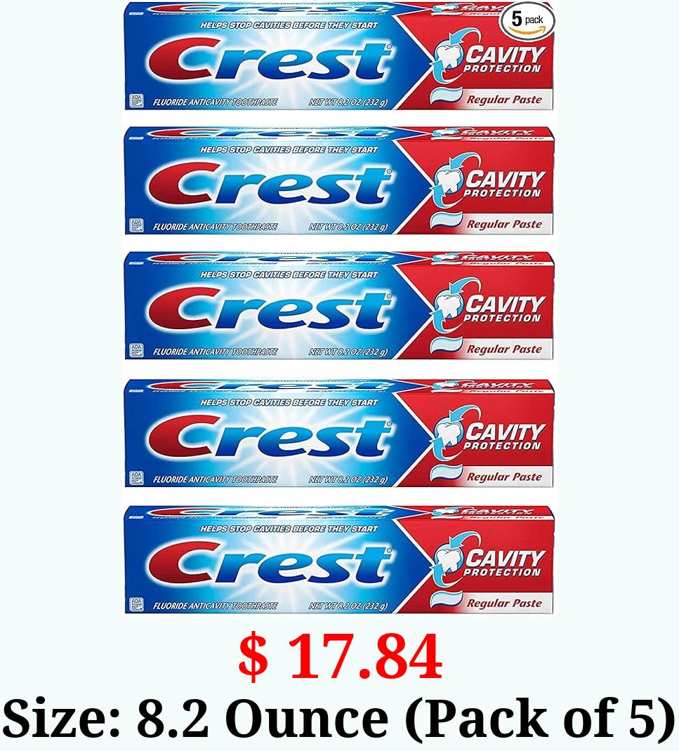 $ 17.84 Size: 8.2 Ounce (Pack of 5) Crest Fluoride Anticavity Toothpaste, Prevents Cavities Before They Start, Regular Paste, 8.2 Ounce (Pack of 5)