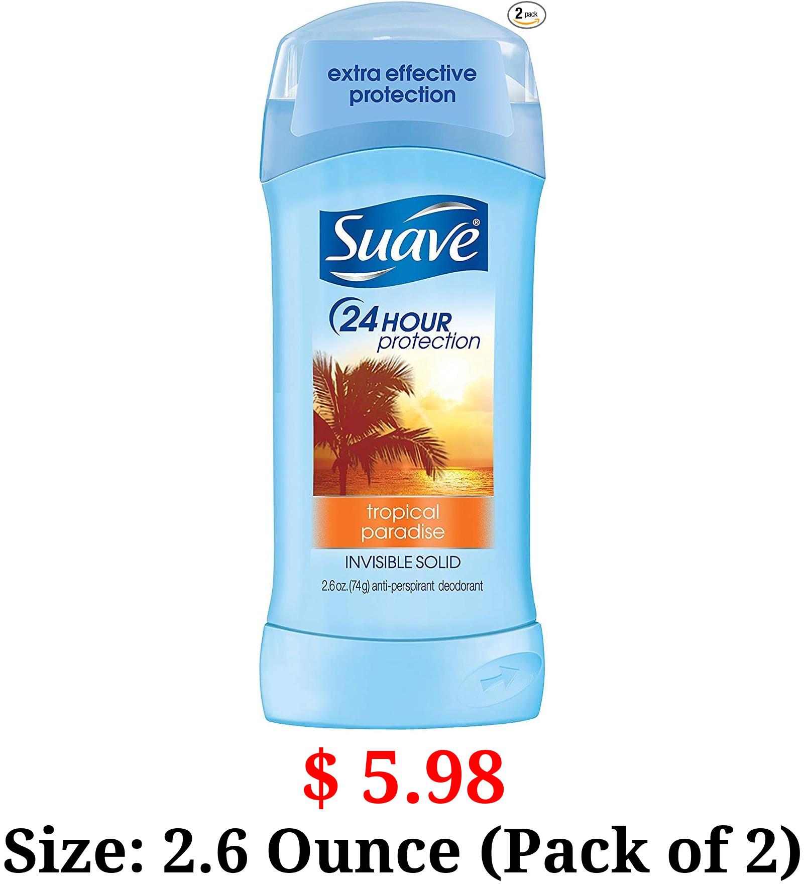 $ 5.98 Size: 2.6 Ounce (Pack of 2) Suave Deodorant 2.6 Ounce 24Hr Tropic Paradise Invis. Solid (76ml) (2 Pack)