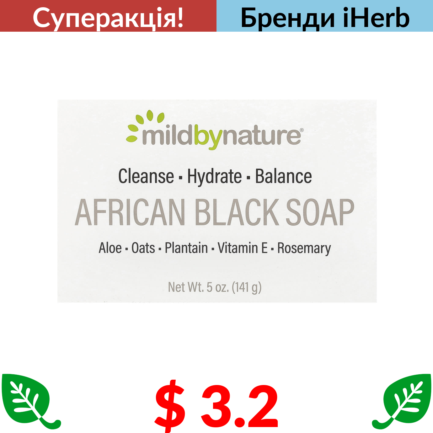 $ 3.2 Mild By Nature, африканське чорне кускове мило, з вівсом і подорожником, 141 г (5 унцій)