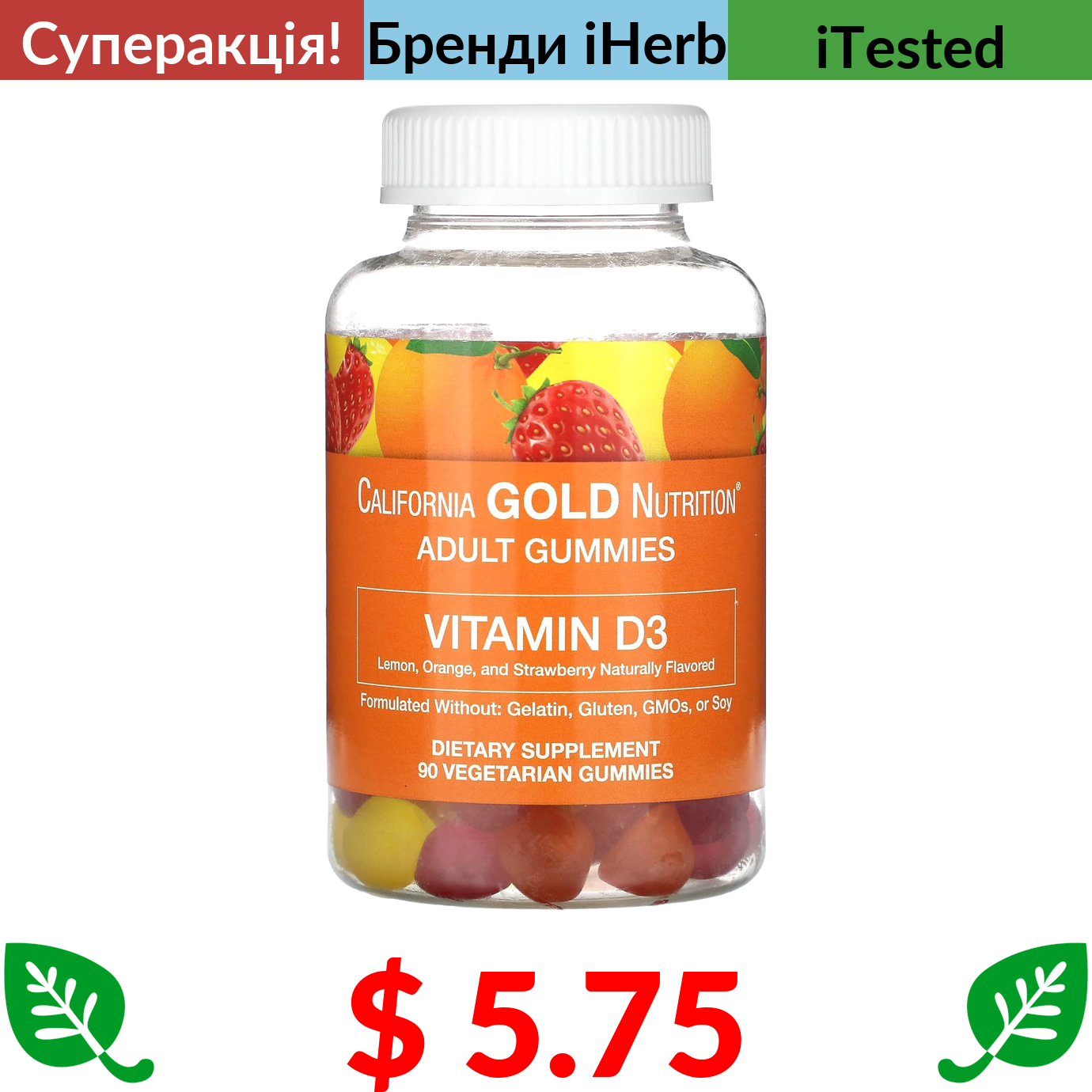 $ 4.9 California Gold Nutrition, вітамін D3, 125 мг (5000 МО), 90 капсул з риб’ячого желатину
