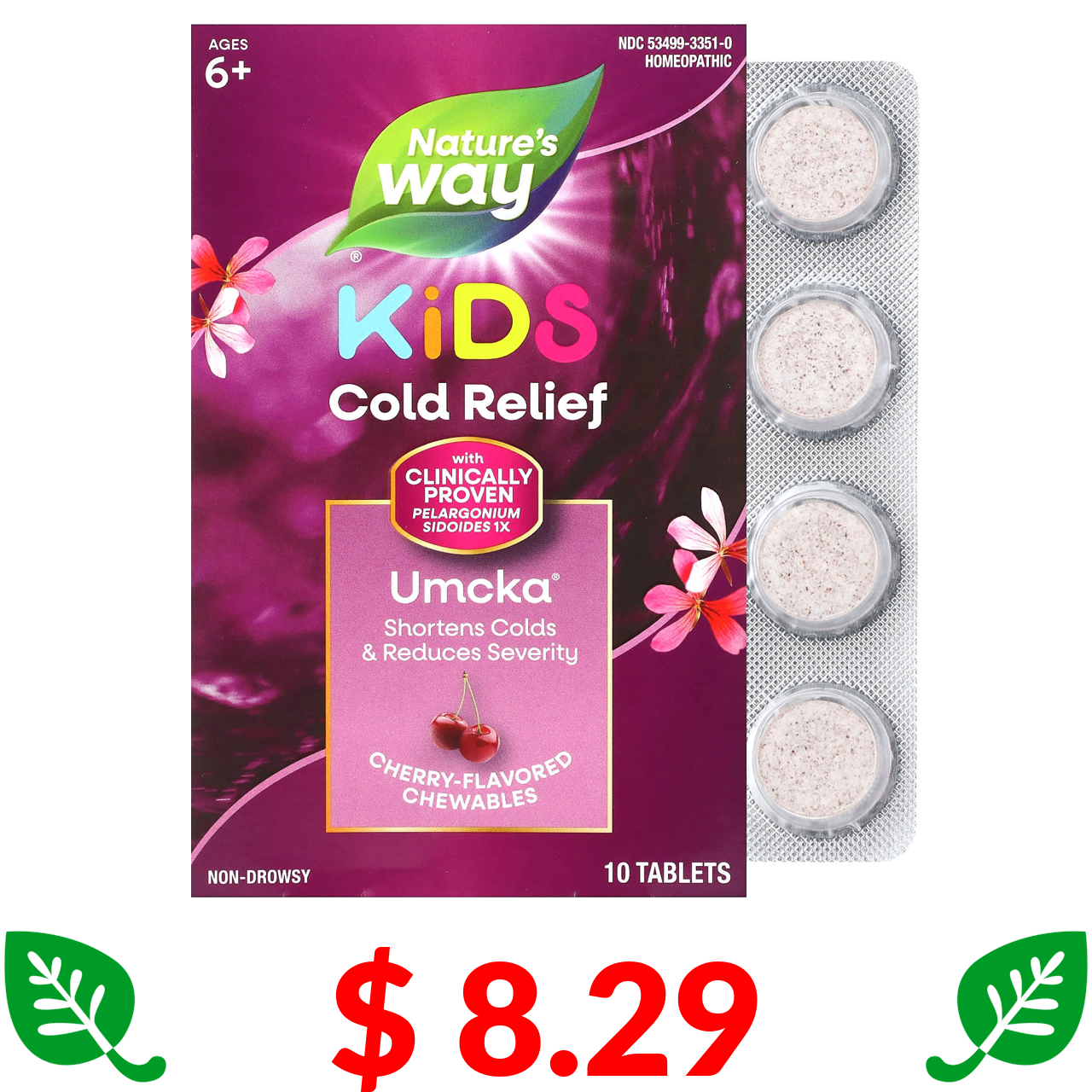 $ 8.29 Nature's Way, Umcka, Kids Cold Relief, Non-Drowsy, For Ages 6+, Cherry , 10 Chewable Tablets