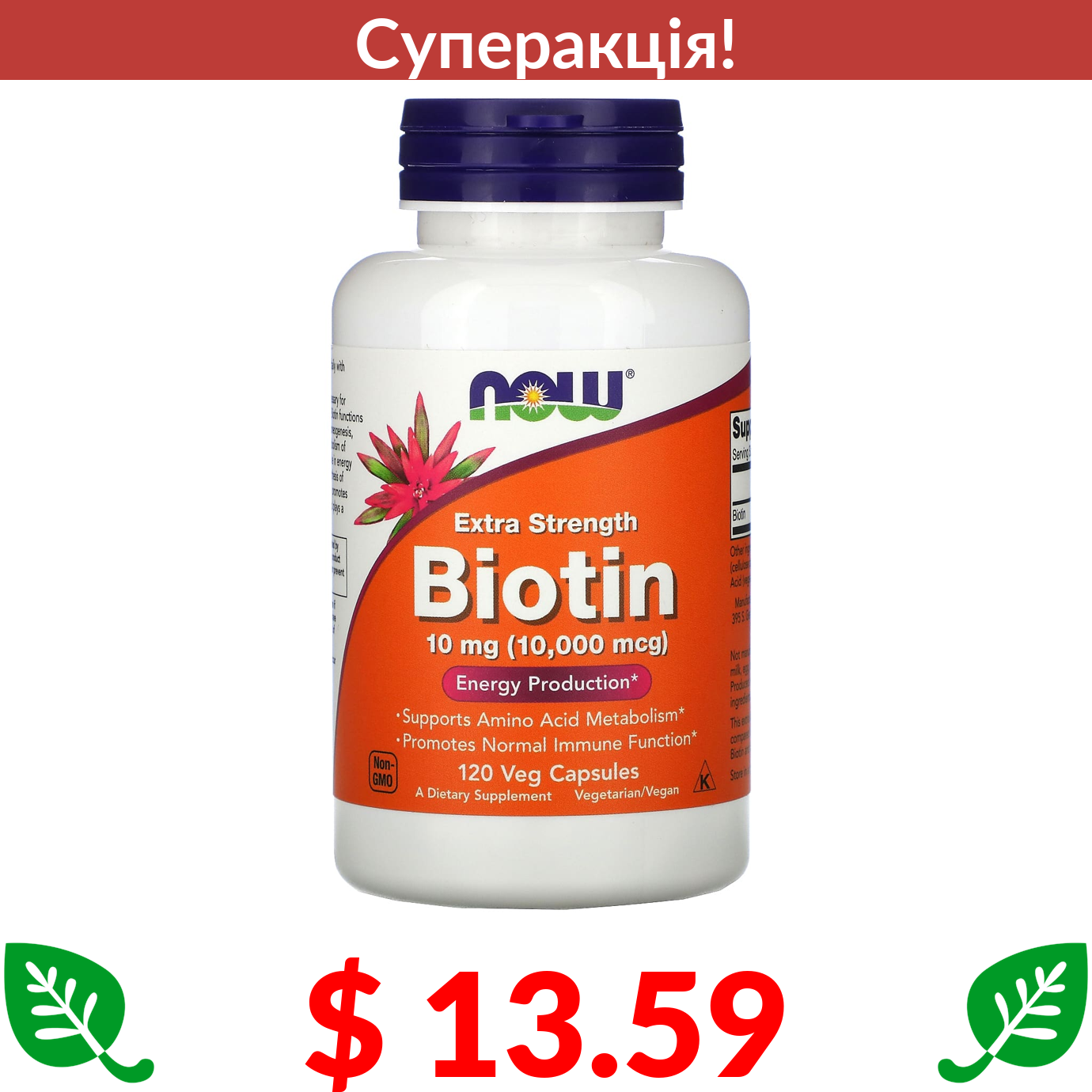 $ 13.59 Now Foods, біотин із посиленою дією, 10 мг (10 000 мкг),120 вегетаріанських капсул